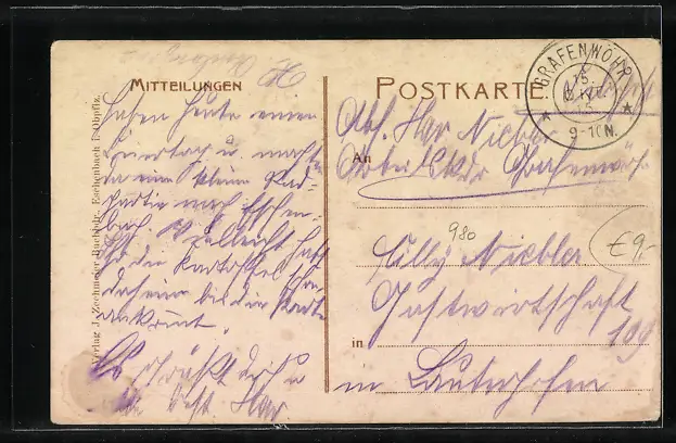 Personenbezogene Daten auf der Rückseite der Karte wurden durch blauen Textmarker unkenntlich gemacht. Die blauen Stellen sind auf die Vorderseite durchgeweicht und wirken sich negativ auf das Postkartenfoto aus