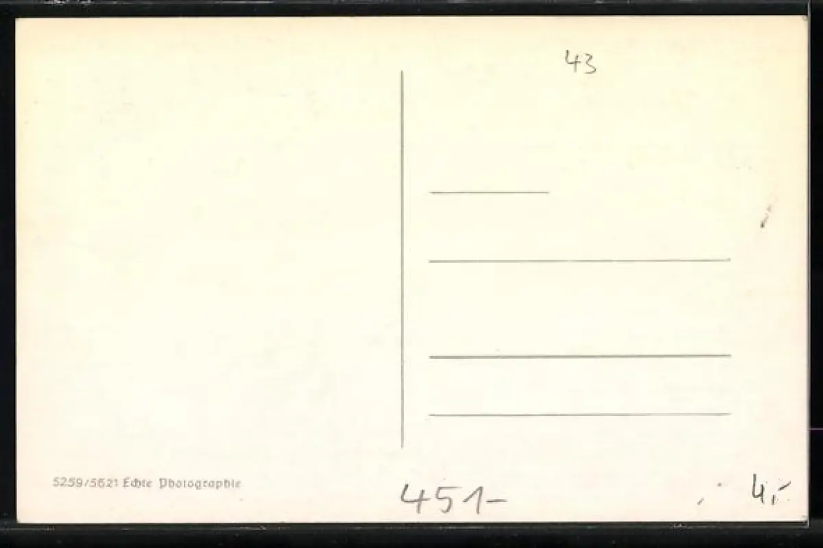 Personenbezogene Daten auf der Rückseite der Karte wurden durch blauen Textmarker unkenntlich gemacht. Die blauen Stellen sind auf die Vorderseite durchgeweicht und wirken sich negativ auf das Postkartenfoto aus