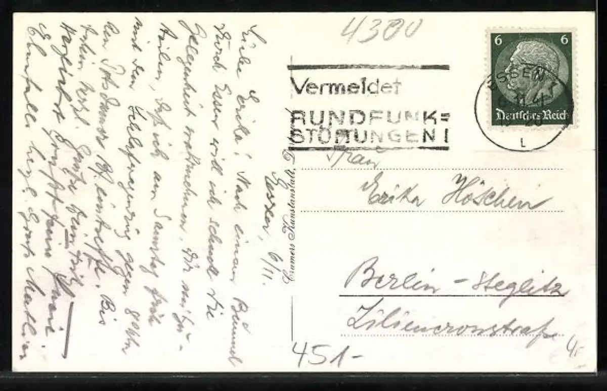 Personenbezogene Daten auf der Rückseite der Karte wurden durch blauen Textmarker unkenntlich gemacht. Die blauen Stellen sind auf die Vorderseite durchgeweicht und wirken sich negativ auf das Postkartenfoto aus