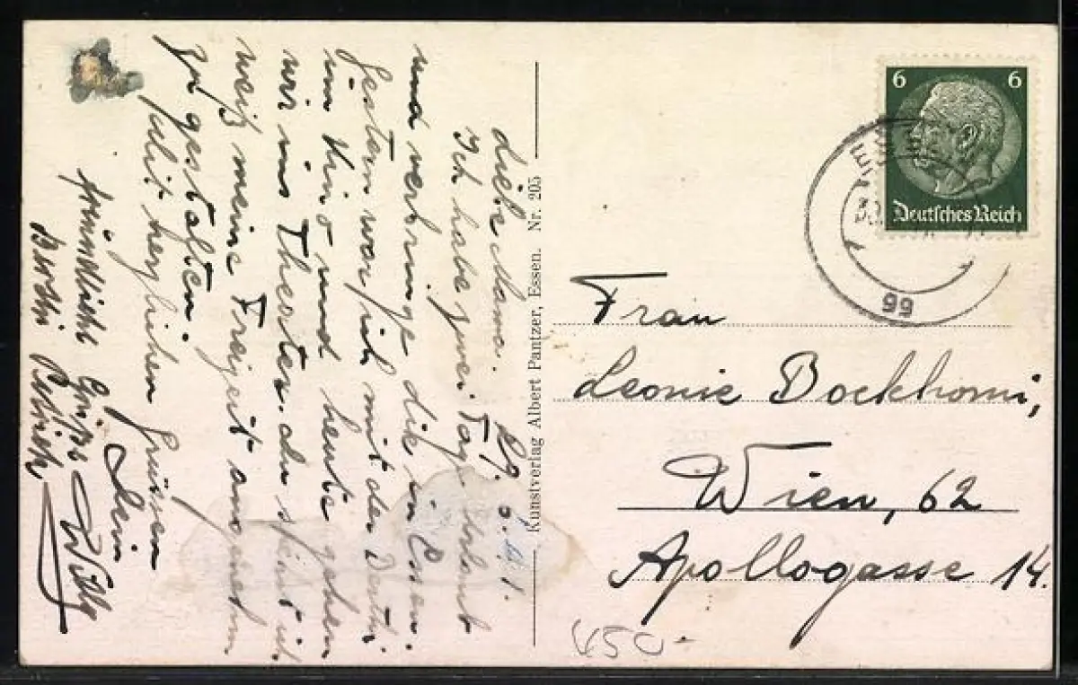 Personenbezogene Daten auf der Rückseite der Karte wurden durch blauen Textmarker unkenntlich gemacht. Die blauen Stellen sind auf die Vorderseite durchgeweicht und wirken sich negativ auf das Postkartenfoto aus