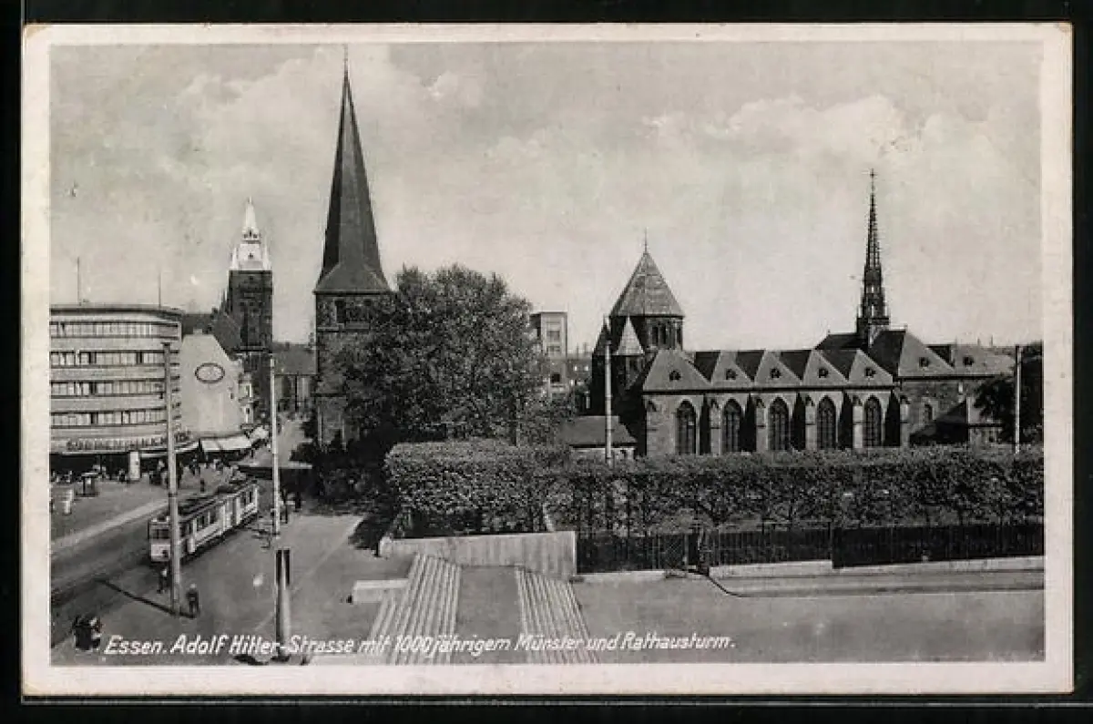 AK Essen / Ruhr, Strasse, Münster, Rathausturm