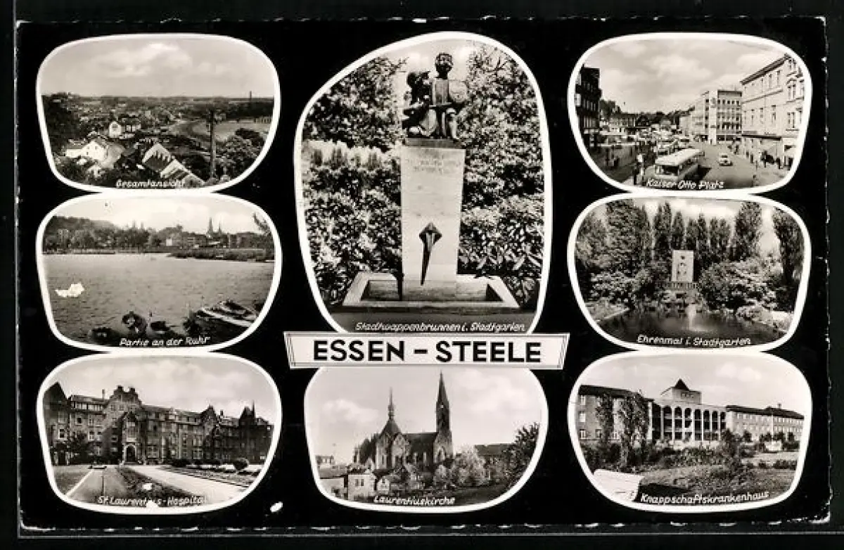 AK Essen-Steele, Laurentiuskirche, Kaiser-Otto-Platz mit Strassenbahn, Ehrenmal im Stadtgarten