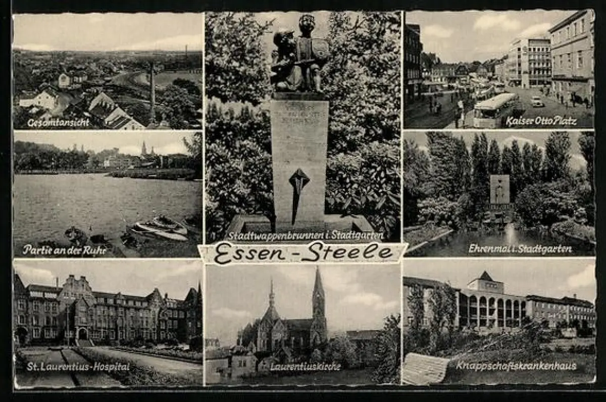 AK Essen-Steele, St. Laurentius-Hospital, Laurentiuskirche, Kaiser-Otto-Platz mit Strassentbahn