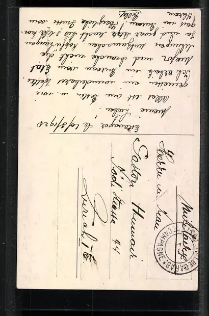 Personenbezogene Daten auf der Rückseite der Karte wurden durch blauen Textmarker unkenntlich gemacht. Die blauen Stellen sind auf die Vorderseite durchgeweicht und wirken sich negativ auf das Postkartenfoto aus