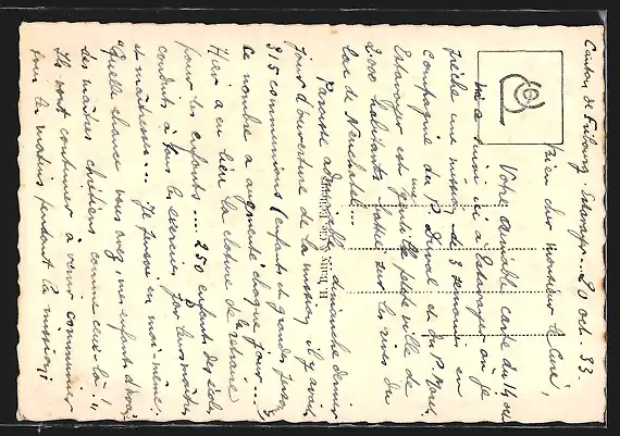 Personenbezogene Daten auf der Rückseite der Karte wurden durch blauen Textmarker unkenntlich gemacht. Die blauen Stellen sind auf die Vorderseite durchgeweicht und wirken sich negativ auf das Postkartenfoto aus