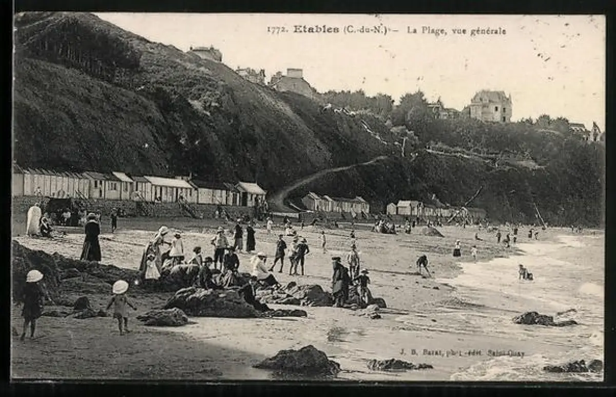AK Étables /C.-du-N., La Plage, vue générale avec baigneurs et cabines de plage