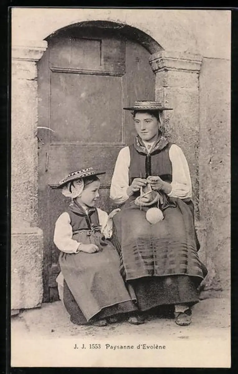 AK Evolene, Mutter mit Tochter in Trachtenkleidern vor einem Hauseingang