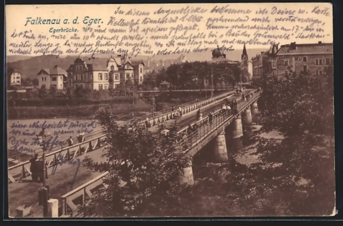 AK Falkenau a. d. Eger, Egerbrücke mit Passanten