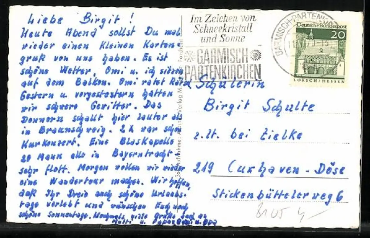 Personenbezogene Daten auf der Rückseite der Karte wurden durch blauen Textmarker unkenntlich gemacht. Die blauen Stellen sind auf die Vorderseite durchgeweicht und wirken sich negativ auf das Postkartenfoto aus