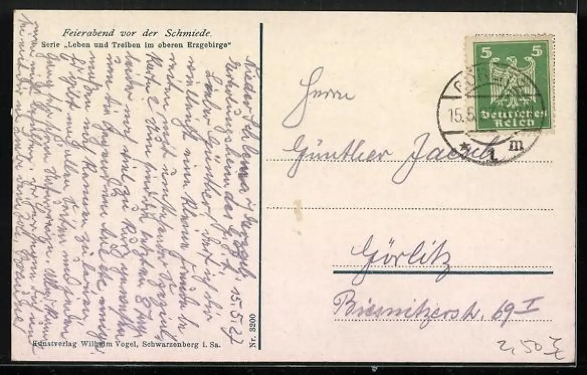 AK Feierabend vor der Schmiede, sächsische Tracht