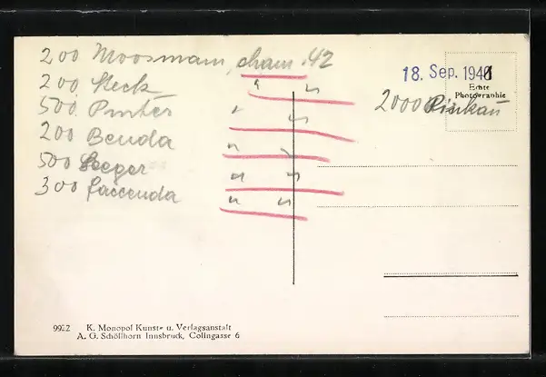 Personenbezogene Daten auf der Rückseite der Karte wurden durch blauen Textmarker unkenntlich gemacht. Die blauen Stellen sind auf die Vorderseite durchgeweicht und wirken sich negativ auf das Postkartenfoto aus