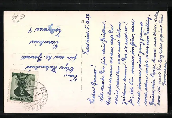 Personenbezogene Daten auf der Rückseite der Karte wurden durch blauen Textmarker unkenntlich gemacht. Die blauen Stellen sind auf die Vorderseite durchgeweicht und wirken sich negativ auf das Postkartenfoto aus