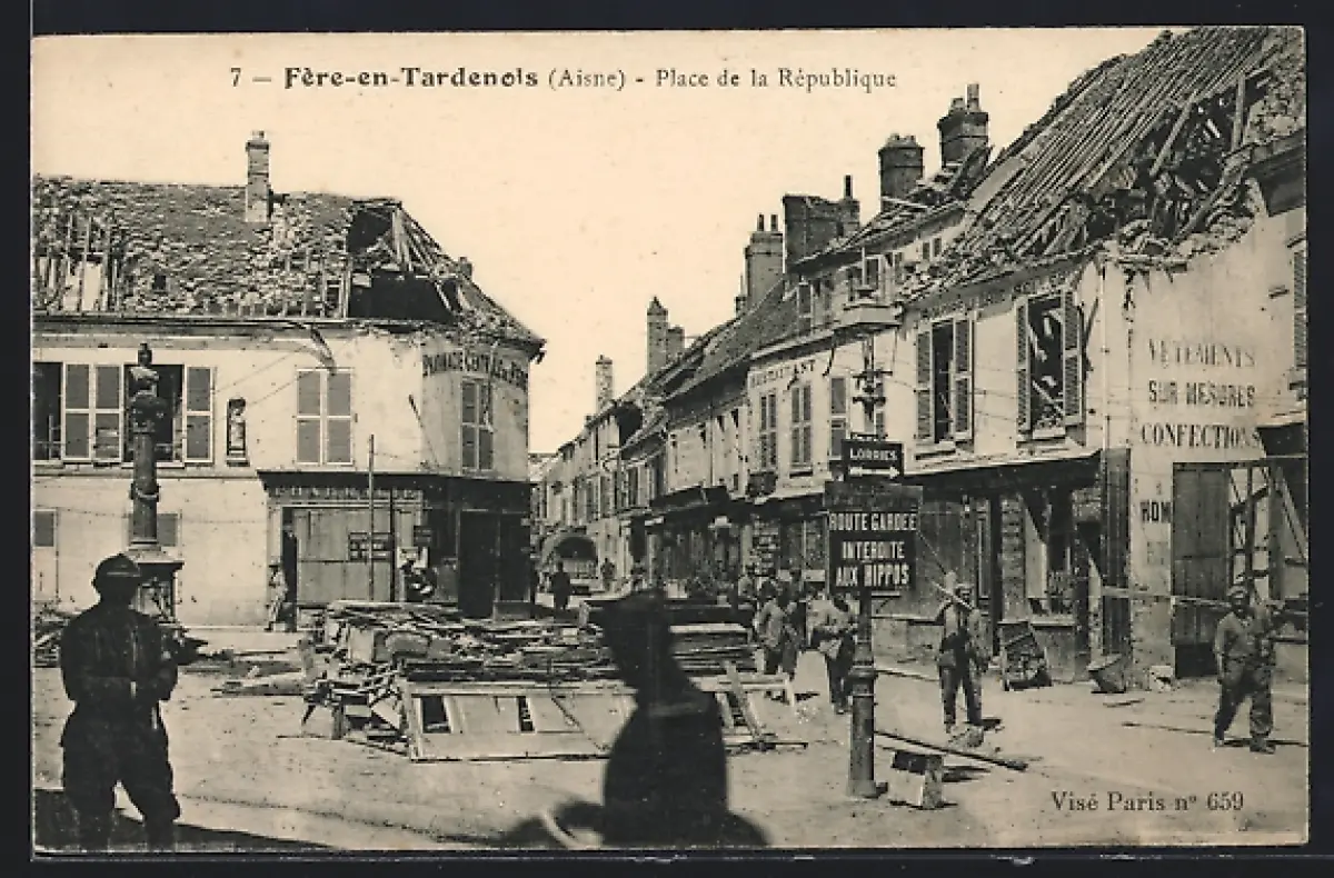 AK Fère-en-Tardenois /Aisne, Place de la République avec bâtiments endommagés