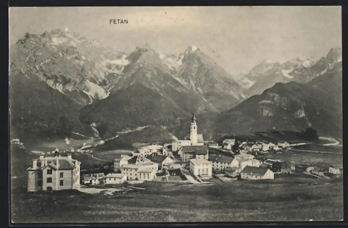 AK Fetan, Ortsansicht mit Kirche aus der Vogelschau