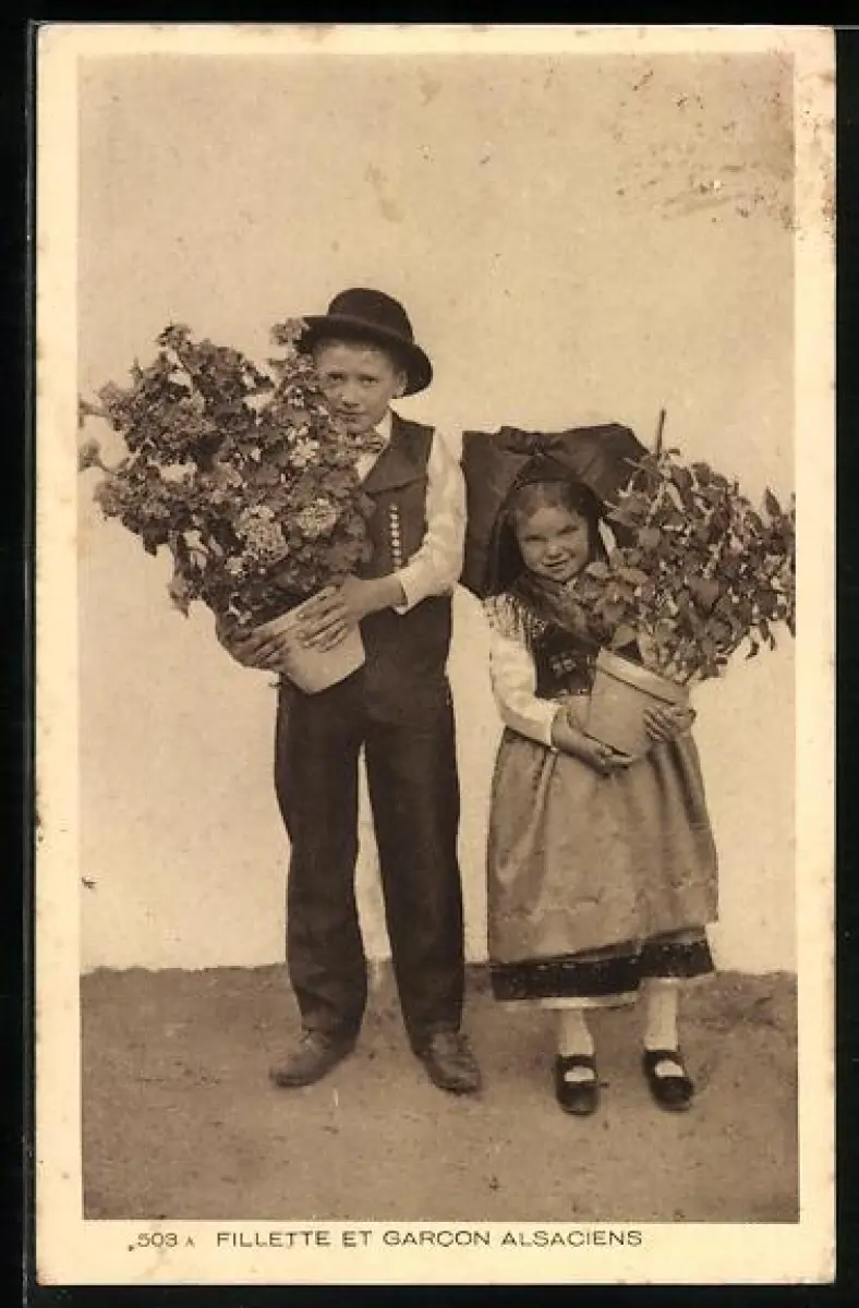AK Fillette et Garcon Alsaciens, Kinderpaar mit Blumentöpfen