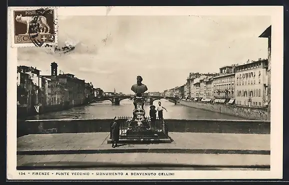 AK Firenze, Ponte vecchio e Monumento a Benvenuto Cellini