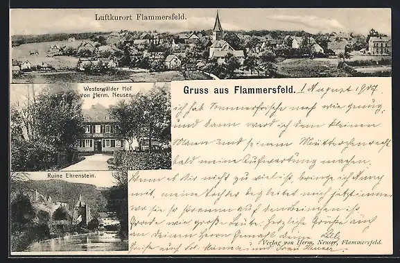 AK Flammersfeld, Totalansicht, Ruine Ehrenstein, Gasthaus Westerwölder Hof