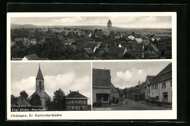 AK Flehingen /Karlsruhe, Ortsansicht aus der Vogelschau, Evgl. Kirche und Pfarrhaus, Hauptstrasse