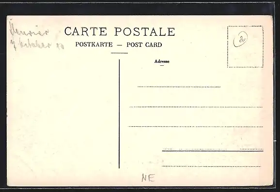 Personenbezogene Daten auf der Rückseite der Karte wurden durch blauen Textmarker unkenntlich gemacht. Die blauen Stellen sind auf die Vorderseite durchgeweicht und wirken sich negativ auf das Postkartenfoto aus
