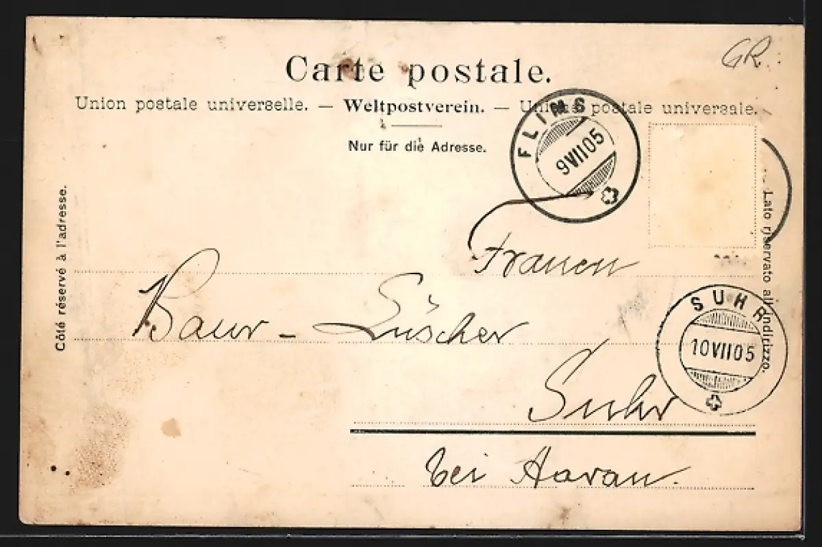 gelaufen 1905, Briefmarke entfernt, Bugspur re., guter Zustand