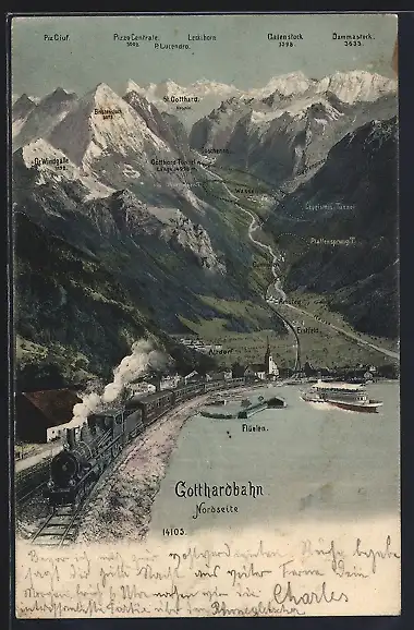 AK Flüelen, Schweizer Gotthardbahn mit ihrem Weg durch die Alpen