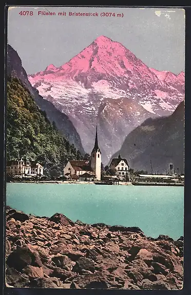 AK Fluelen, Partie an der Kirche mit Dampfer u. Bristenstock