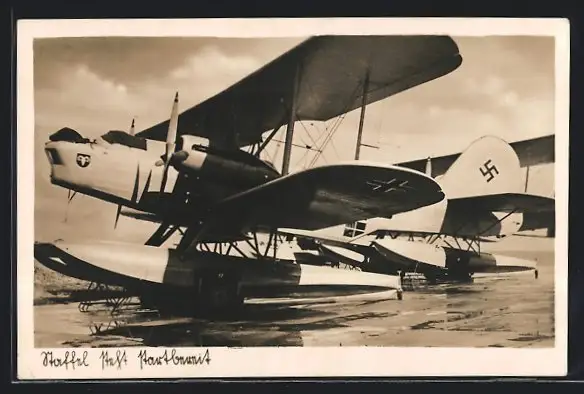 AK Flugboot mit am Heck nach der Landung, Staffel steht startbereit