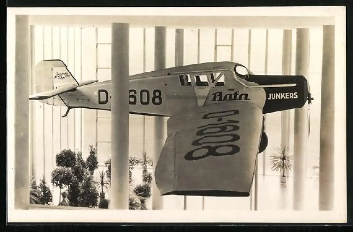 AK Flugzeug Junkers D-1608 in einer Halle ausgestellt