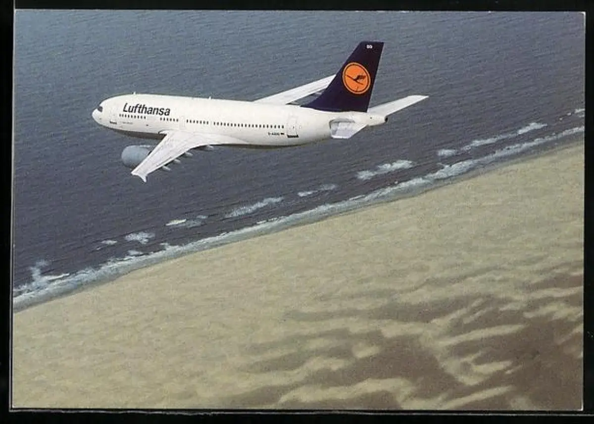 AK Flugzeug, Lufthansa Airbus A310-300 über Strand hinwegfliegend