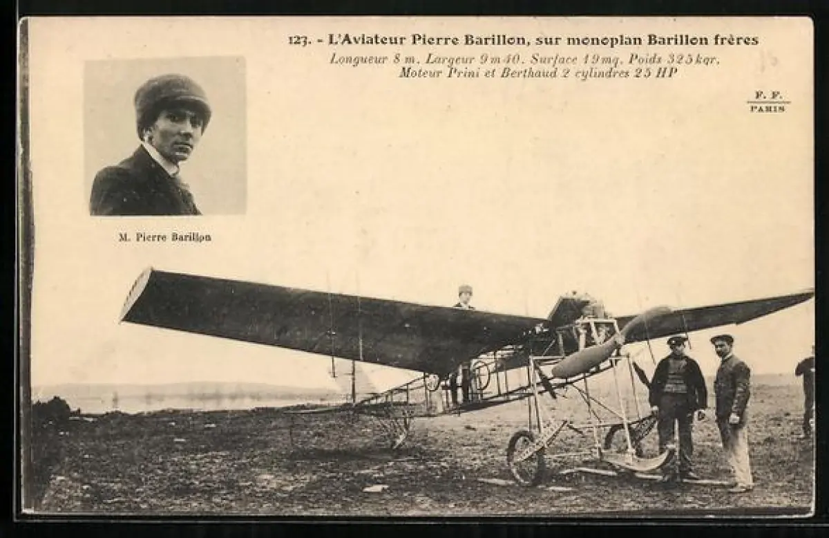 AK Flugzeug der Barillon-Brüder auf einem Feld, Pilot Pierre Barillon