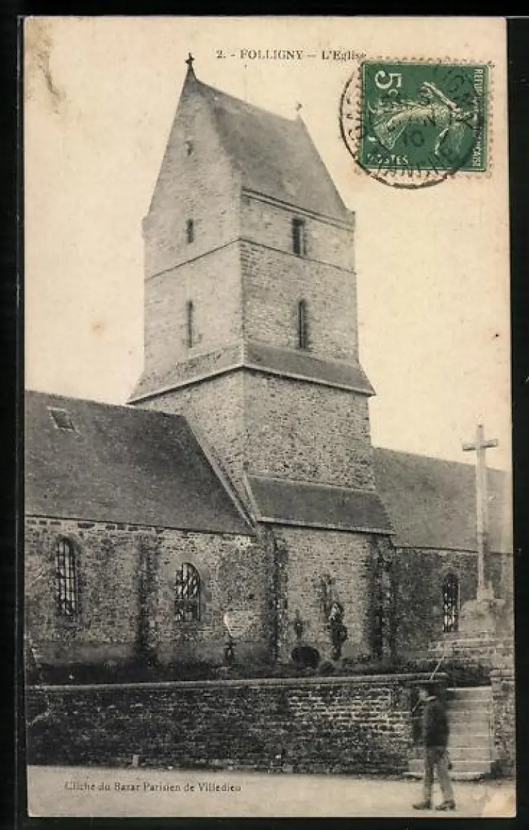 AK Folligny, L`Église et le calvaire devant l`édifice
