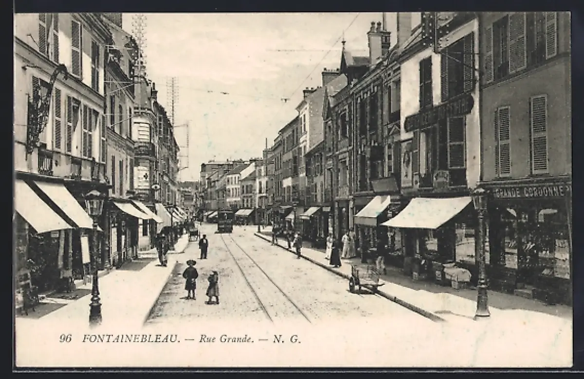 AK Fontainebleau, Rue Grande, Strassenpartie mit Strassenbahn