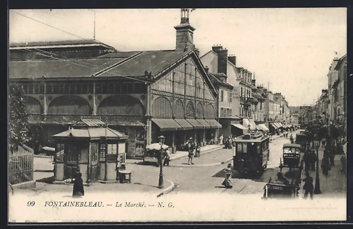 AK Fontainenbleau, Le Marché, Strassenbahn