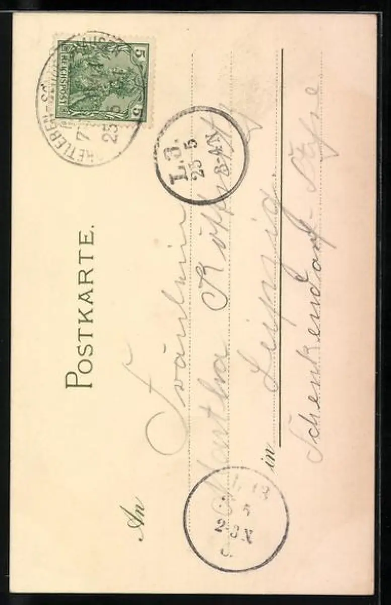 gelaufen 1901, vorderseitig Klebe- und Papierreste, guter Zustand