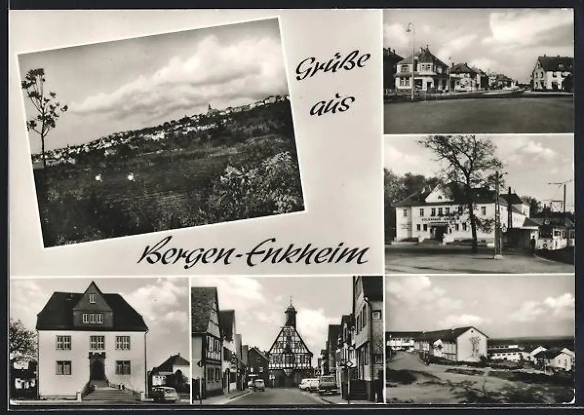 AK Frankfurt-Bergen-Enkheim, Totalansicht, Wohnhäuser, Ortspartie mit Siedlung, Blick auf die Kirche, Fachwerkhäuser