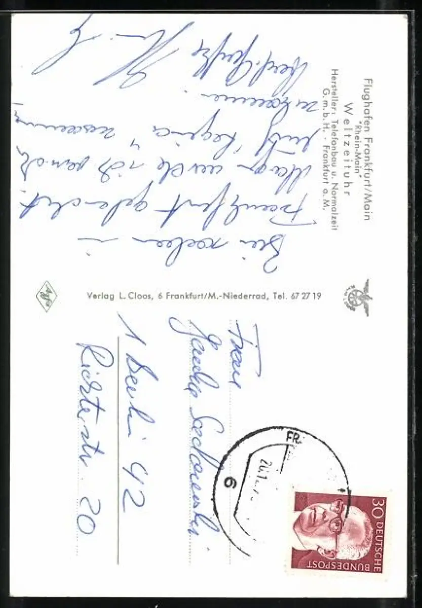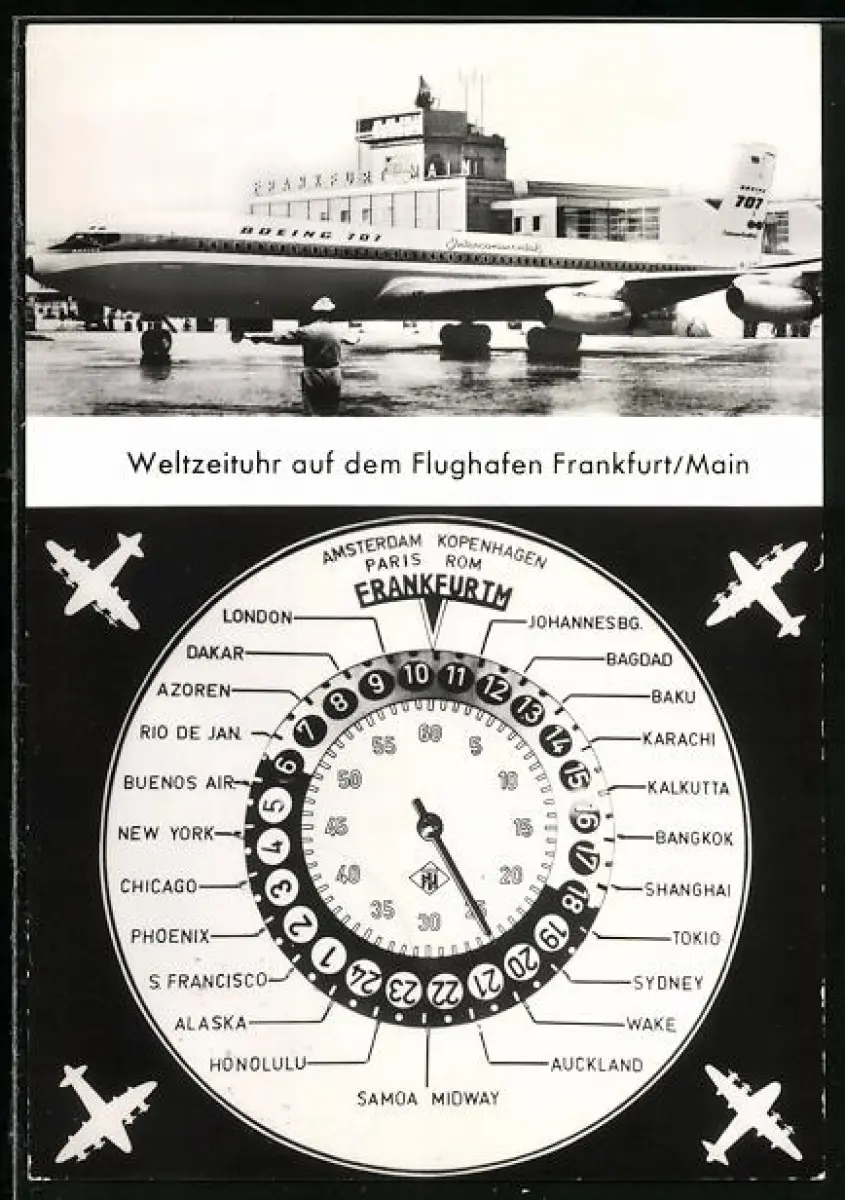 AK Frankfurt /Main, Boeing 707 auf dem Flughafen, Weltzeituhr