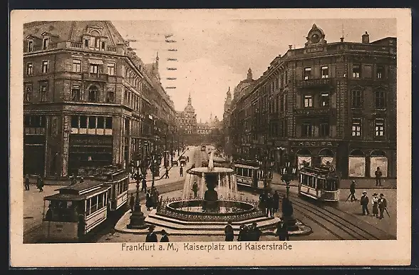 AK Frankfurt /Main, Strassenbahnen in der Kaiserstrasse und am Kaiserplatz, Springbrunnen