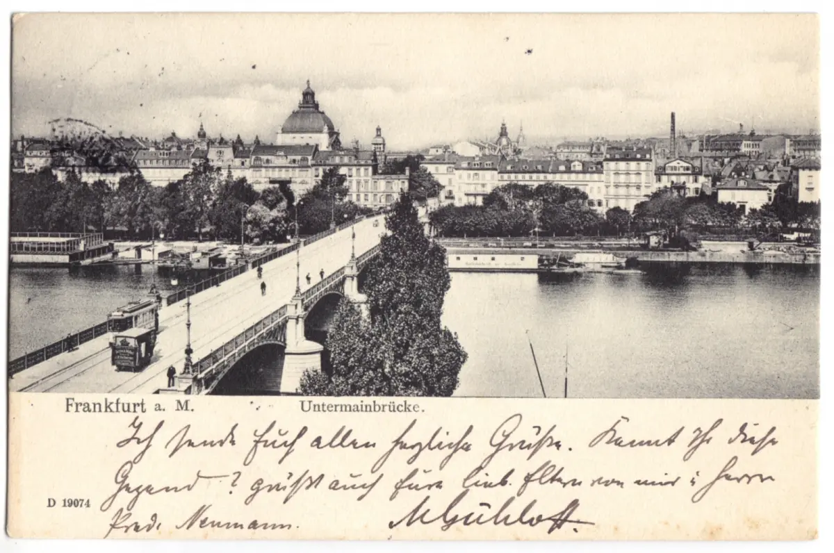 Ansichtskarte Frankfurt Main Teilansicht mit Untermainbrücke Erhaltung I-II postalisch gelaufen, gestempelt: Frankfurt (Main) 4, 14.5.04 Verlag: Lautz & Balzar, Darmstadt Im Inland erfolgt die Zusendung versandkostenfrei Auslandsversand erfolgt über