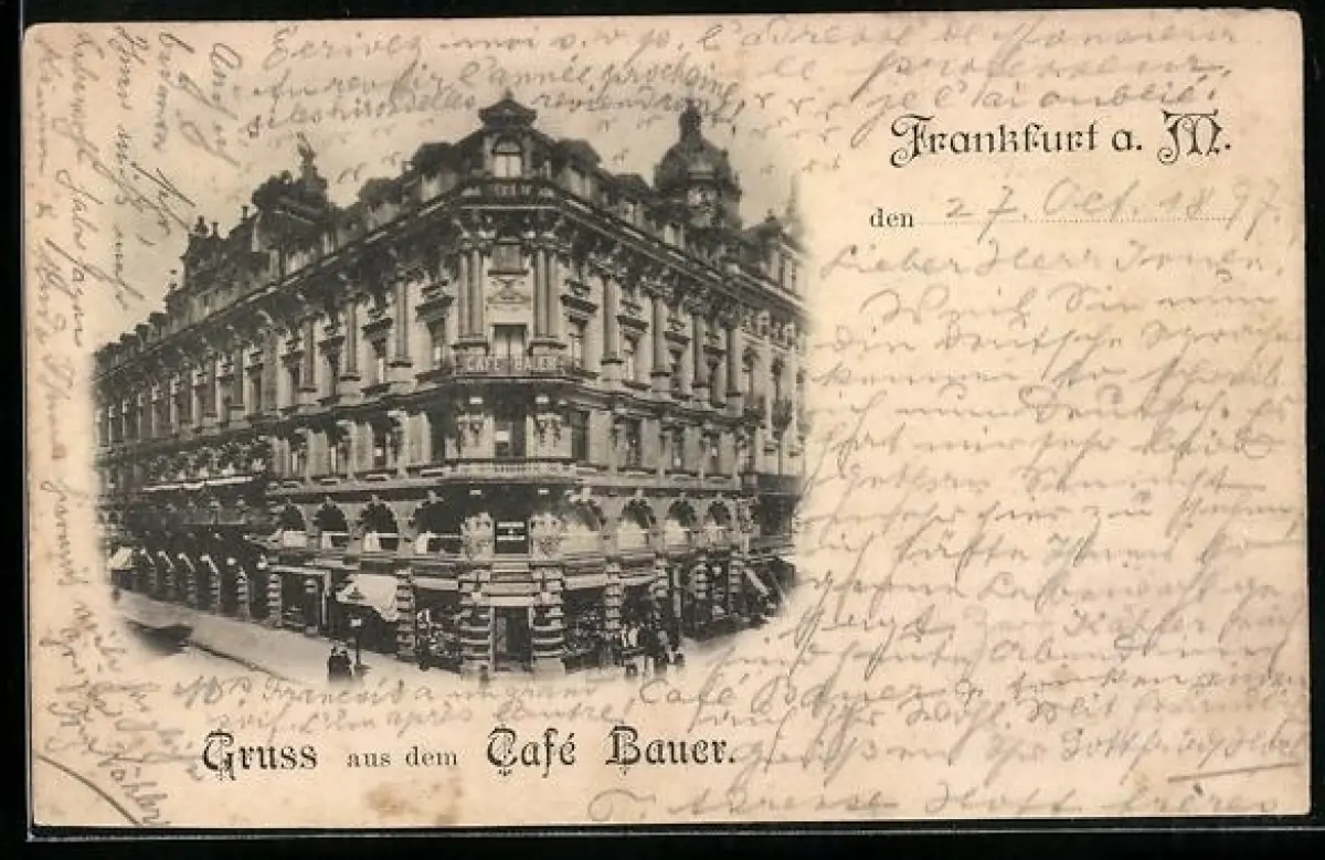 AK Frankfurt a. M., Cafe Bauer mit Strassenpartie