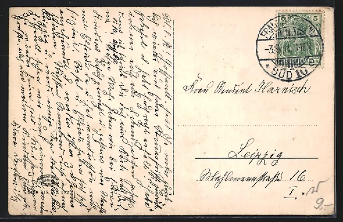 Personenbezogene Daten auf der Rückseite der Karte wurden durch blauen Textmarker unkenntlich gemacht. Die blauen Stellen sind auf die Vorderseite durchgeweicht und wirken sich negativ auf das Postkartenfoto aus