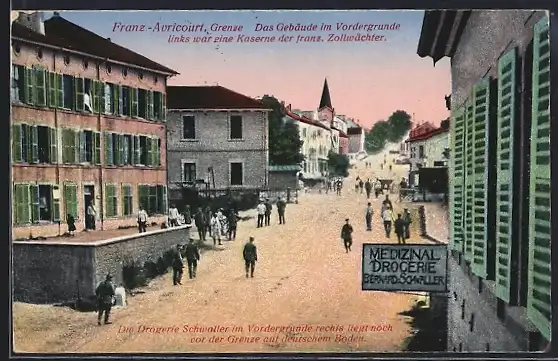 AK Franz.-Avricourt, Drogerie Schwaller, Gebäude im Vordergrunde, links war eine Kaserne der franz. Zollwächter, Grenze