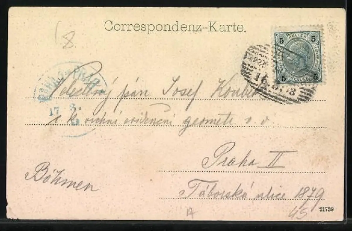 Personenbezogene Daten auf der Rückseite der Karte wurden durch blauen Textmarker unkenntlich gemacht. Die blauen Stellen sind auf die Vorderseite durchgeweicht und wirken sich negativ auf das Postkartenfoto aus