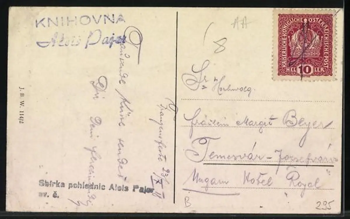 Personenbezogene Daten auf der Rückseite der Karte wurden durch blauen Textmarker unkenntlich gemacht. Die blauen Stellen sind auf die Vorderseite durchgeweicht und wirken sich negativ auf das Postkartenfoto aus
