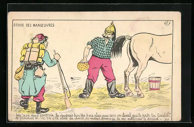 AK Französischer Soldat wäscht sein Pferd, ein anderer kommt mit Marschgepäck in den Stall