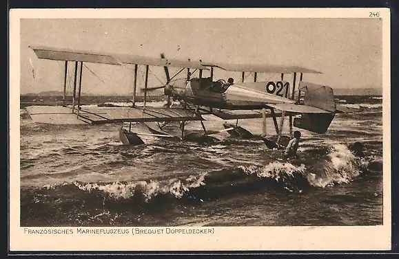 AK Französisches Marineflugzeug Breguet-Doppeldecker vor dem Start vom Meeresstrand