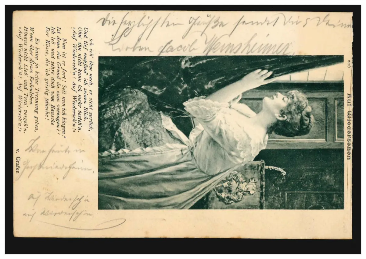 AK Frau am Fenster, Gedicht von Grafen: Ich seh' ihm nach, er sieht zurück, 1901