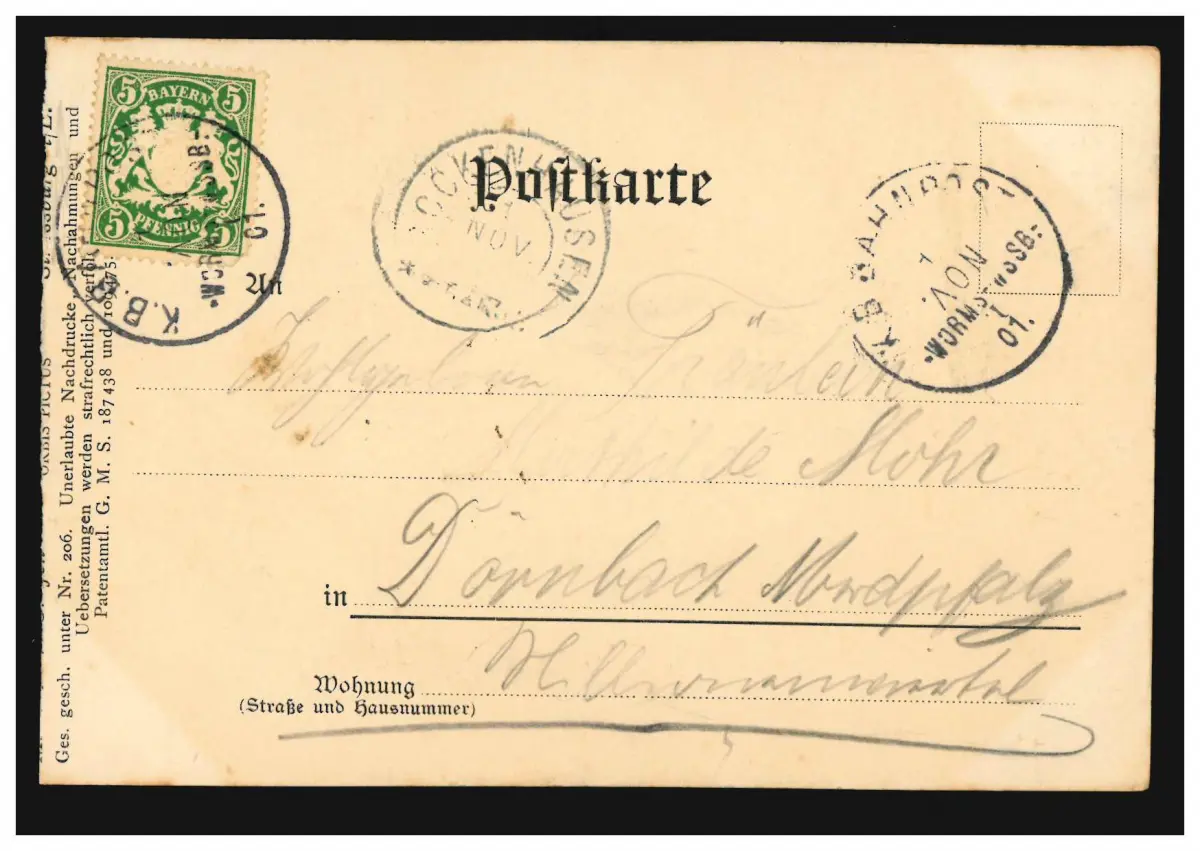mit Bahnpost "K.B. BAHNPOST 1.11.1901 WORMS- ..." über ROCKENHAUSEN 1.11.01 nach Dornbach