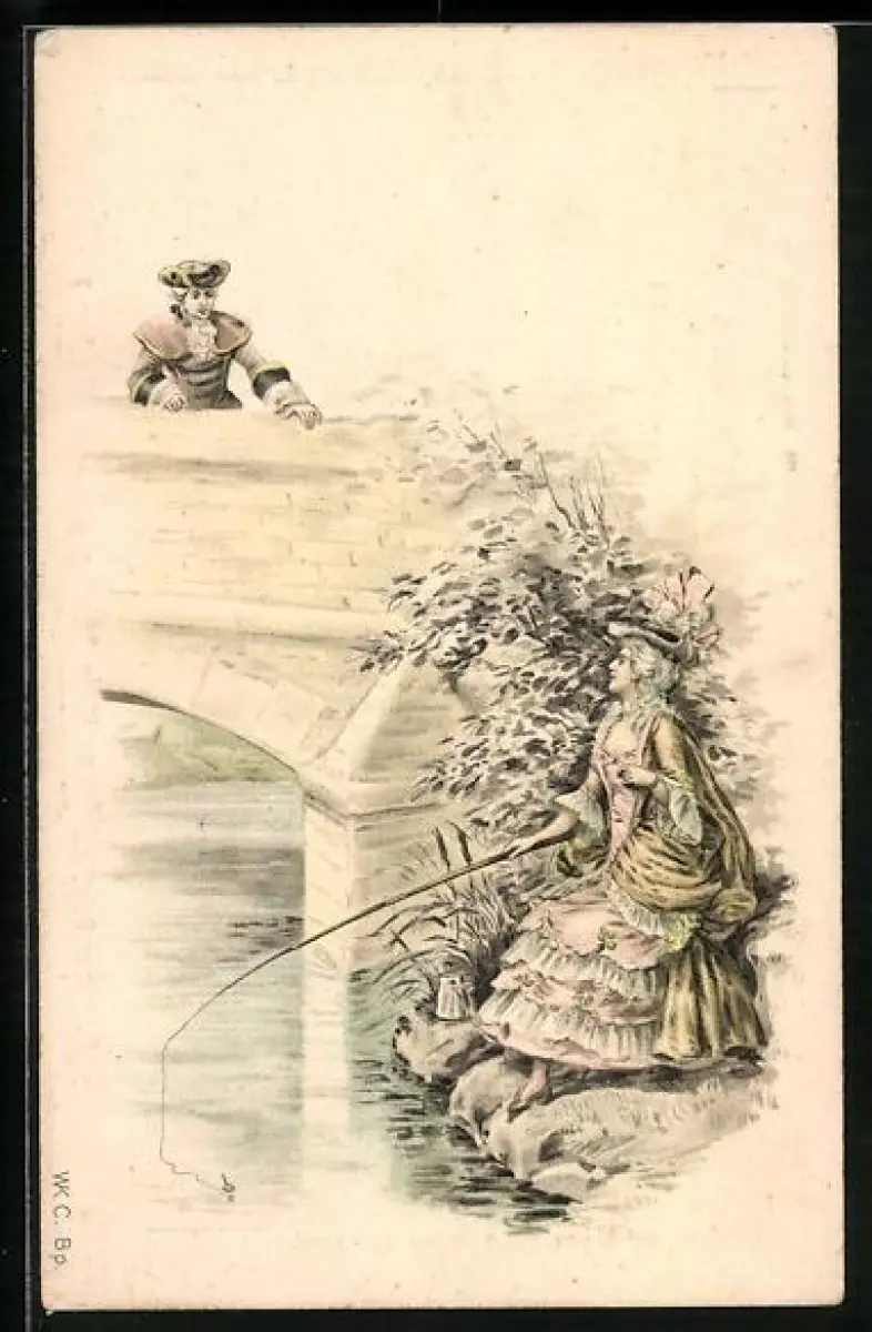 AK Frau beim Angeln schaut zu Herrn auf Brücke