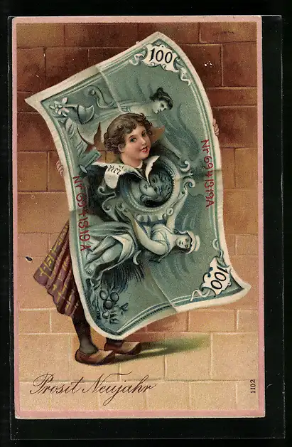 AK Frau durch zerrissenen Geldschein, Neujahrsgruss