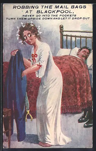 AK Frau durchsucht die Taschen von schlafendem Mann, frauenfeindlicher Humor